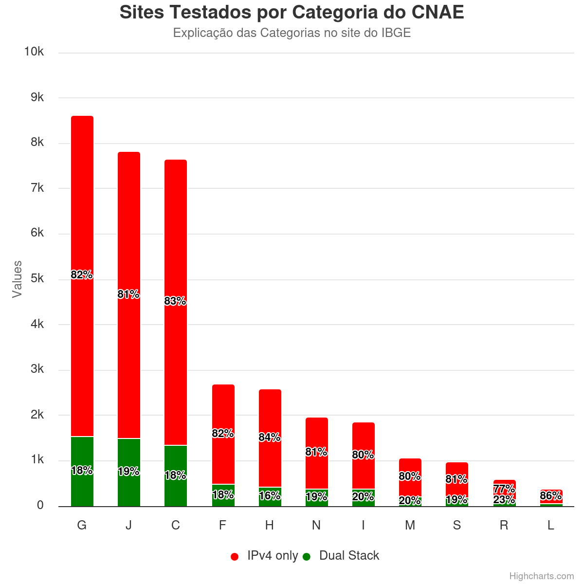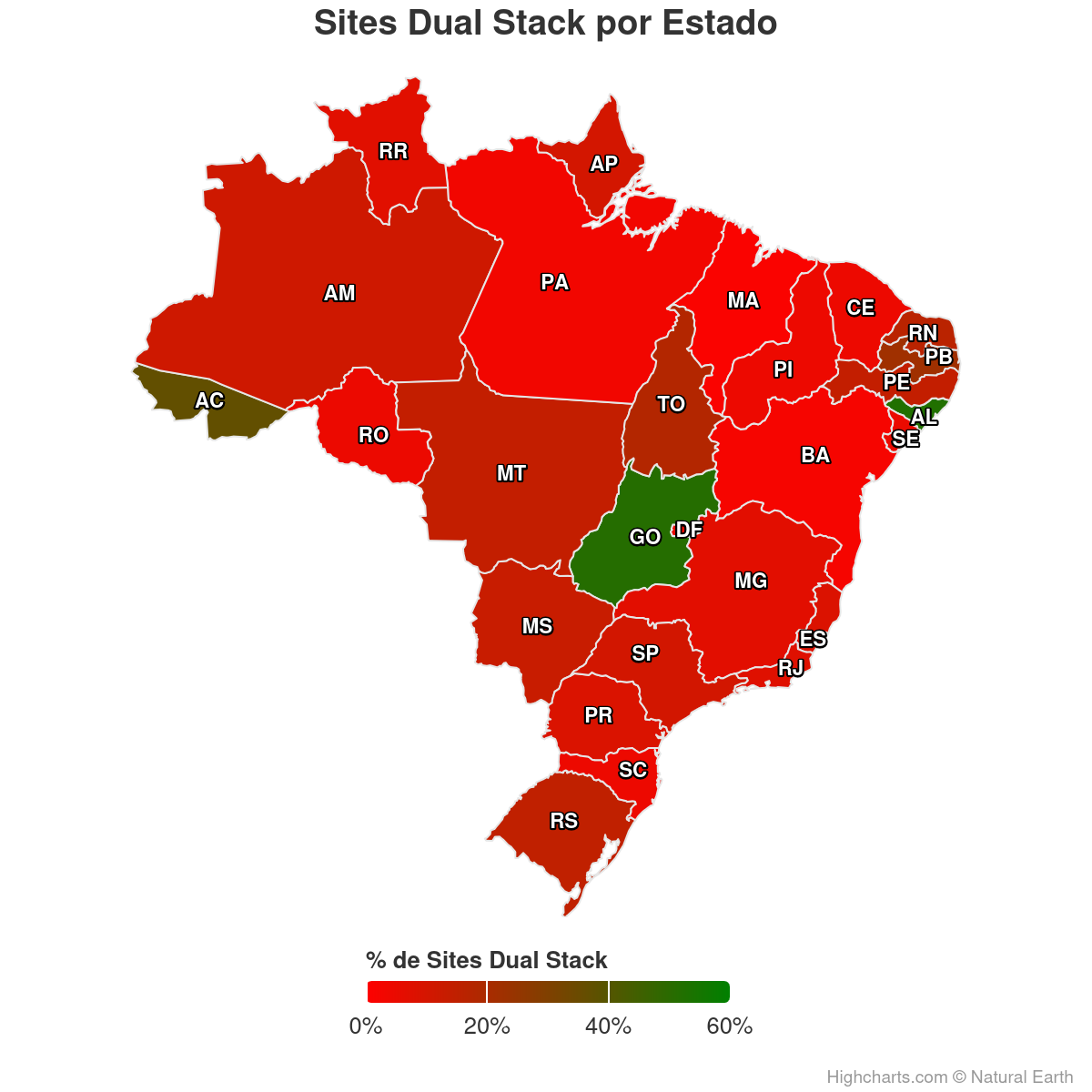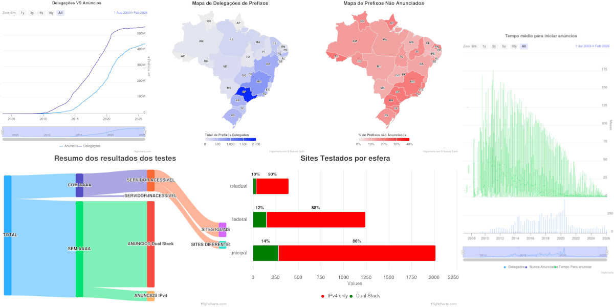 Painel com análise da disponibilidade de IPv6 em sites de instituições públicas brasileiras. Inclui métricas de resolução DNS, acessibilidade via IPv6, infraestrutura de hospedagem e distribuição geográfica.