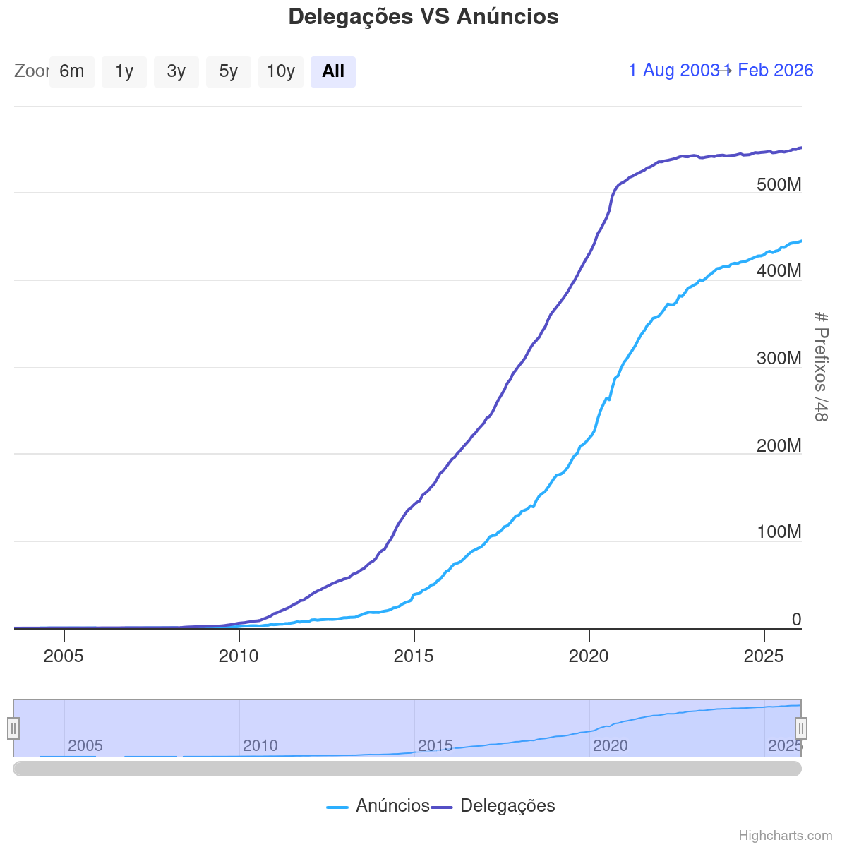 Análise histórica das delegações e anúncios de prefixos IPv6 no Brasil, permitindo acompanhar a evolução da infraestrutura de roteamento e identificar padrões de adoção ao longo do tempo.